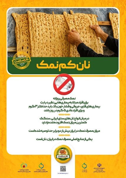 در بخش دیگری از توضیحات دفتر بهبود تغذیه جامعه، اهمیت کاهش مصرف نمک در سبد غذایی روزانه مورد تأکید قرار گرفته است. میزان مجاز مصرف نمک برای بیماران مبتلا به دیابت، فشار خون بالا و بیماریهای قلبی–عروقی حداکثر ۳ گرم و برای افراد سالم ۵ گرم در روز عنوان شده است. در میان نانهای سنتی ایرانی نیز نان سنگک کمترین میزان نمک افزوده را دارد. این دفتر با اشاره به اینکه مصرف نمک در ایران بیش از دو برابر حد توصیهشده است، نان را یکی از منابع اصلی دریافت نمک در کشور معرفی کرد.